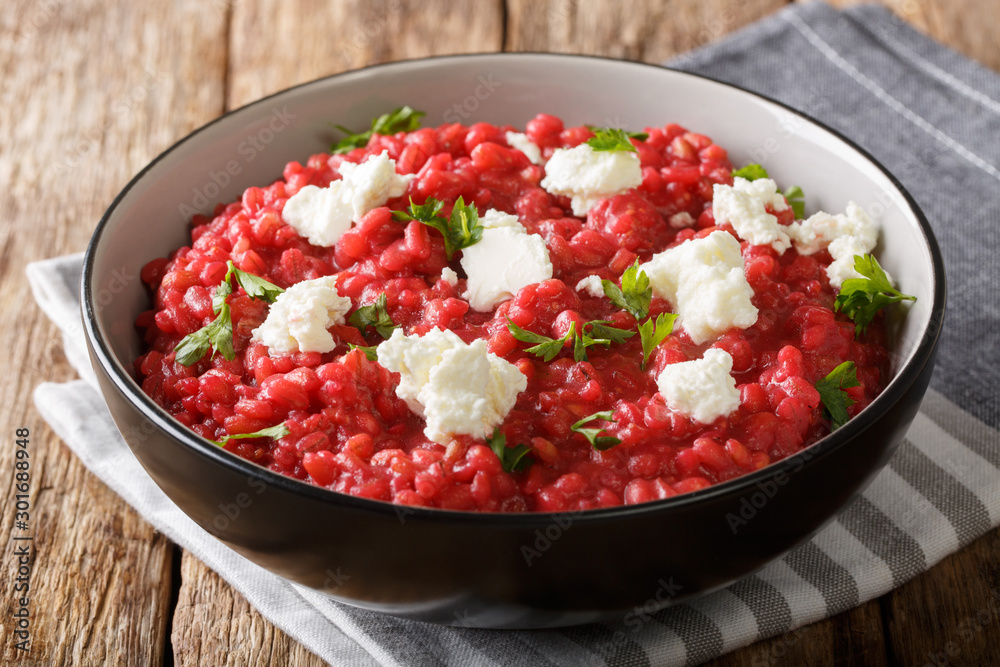 Healthy Orzotto cooked from pearl barley with beets and goat cheese close-up on a plate. horizontal
