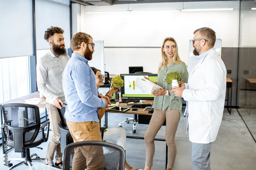 Group of diverse people working on the packaging design of a new eco product in the office. Branding and marketing of new trendy foods concept