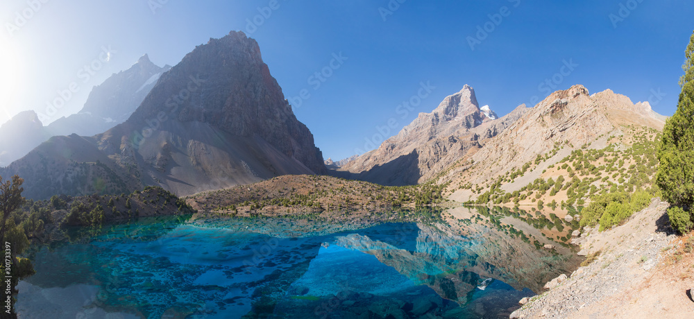 Beautiful summer mountains. Amazing turquoise mountain lake. Scenery nature in Asian highlands. Panoramic landscape of vivid blue water