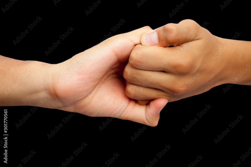 Isolated hands of male teenagers doing Ganesha Yoga Mudra with two hands-on black background.Horizontal shot.