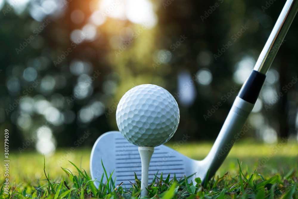 Blurred golf club and golf ball close up in grass field with sunset. Golf ball close up in golf coures at Thailand