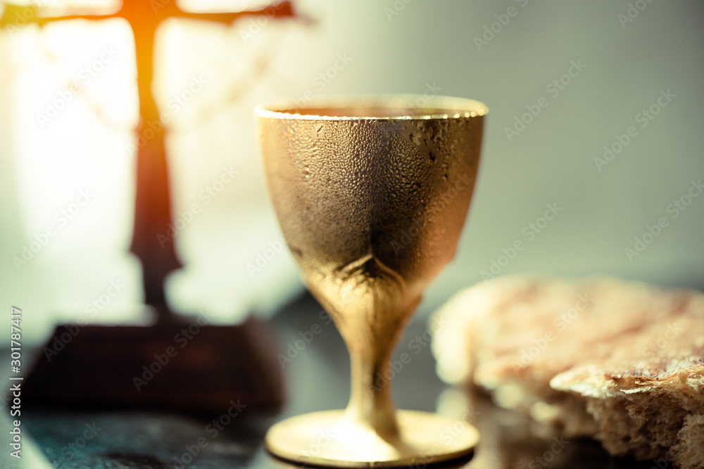 Holy communion on wooden table on church.Taking holy Communion.Cup of glass with red wine, bread.The Feast of Corpus Christi Concept.