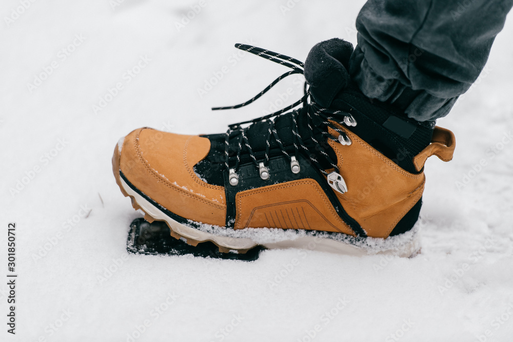 Male leg in brown heavy boot stepping on the smartphone lying in snow. Concept of phone protective glass.