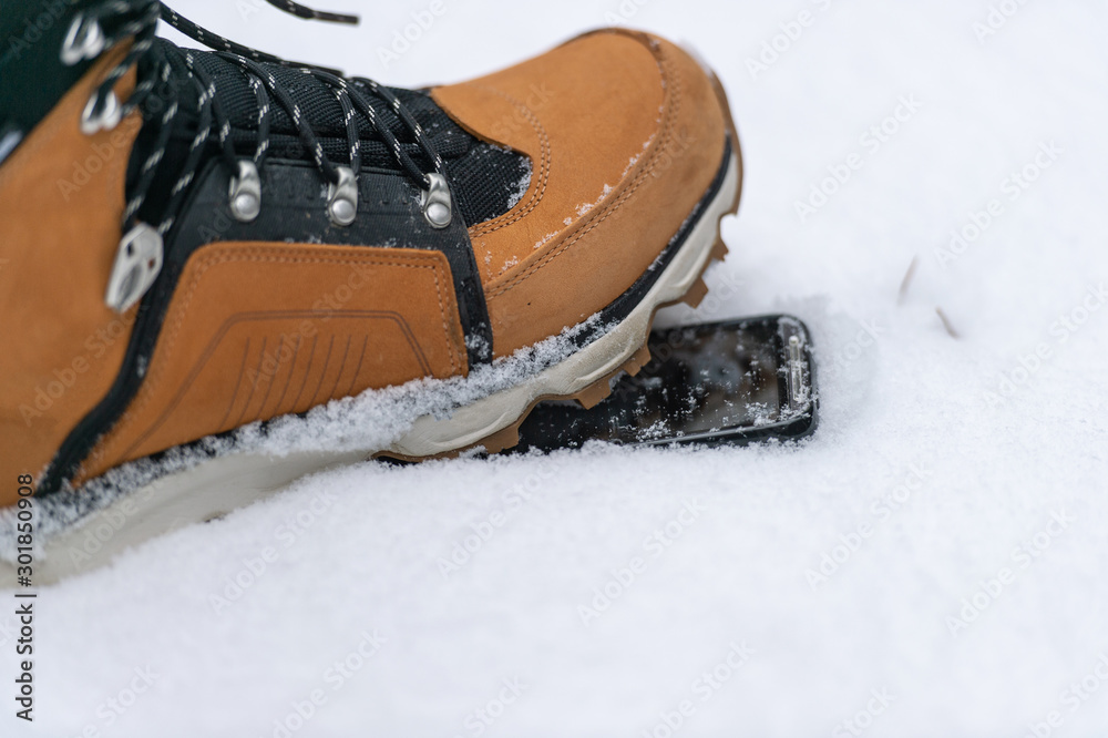 Male leg in brown heavy boot stepping on the smartphone lying in snow. Concept of phone protective glass.
