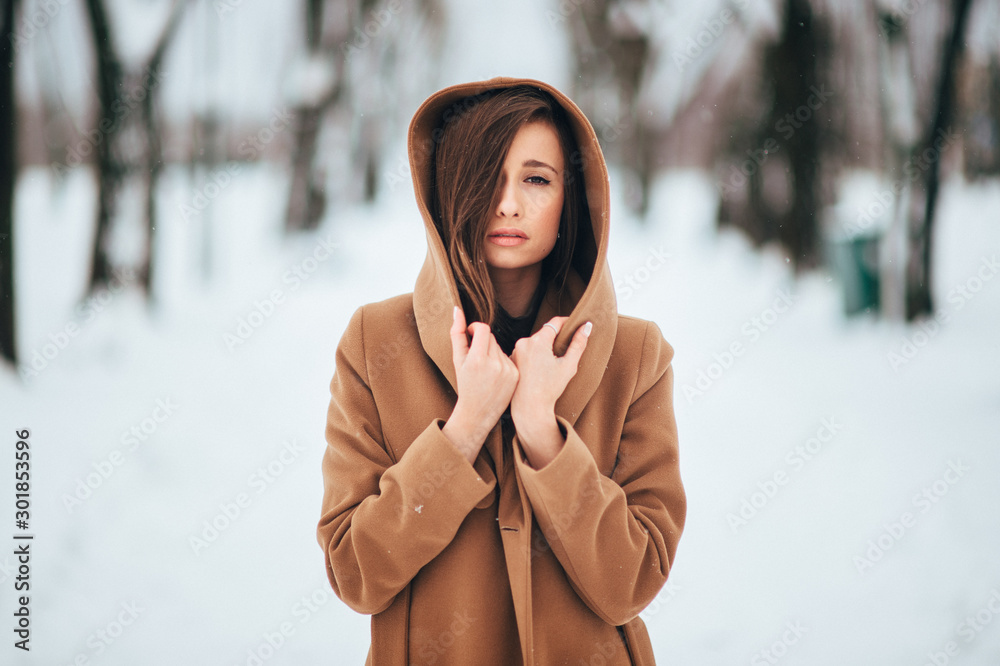 Closeup portrait of beautiful long haired brunnette girl with georgian appearance posing in brown jacket in winter park