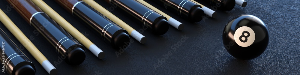Eight ball, pool banner with cues and black ball.