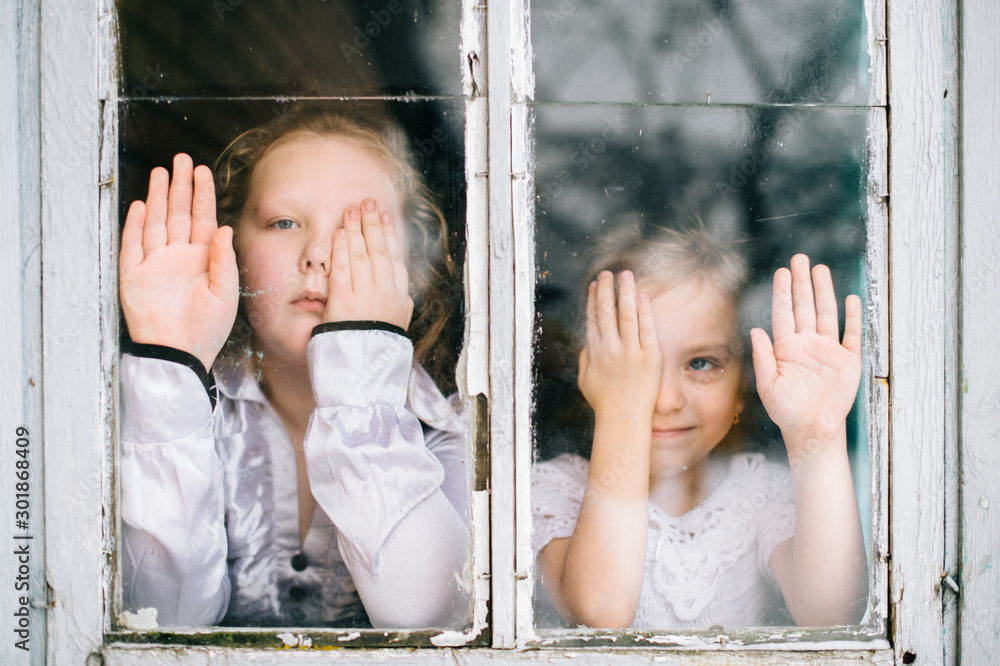 Two little girls covering their eye with a hand and looking at window with funny facial expressions