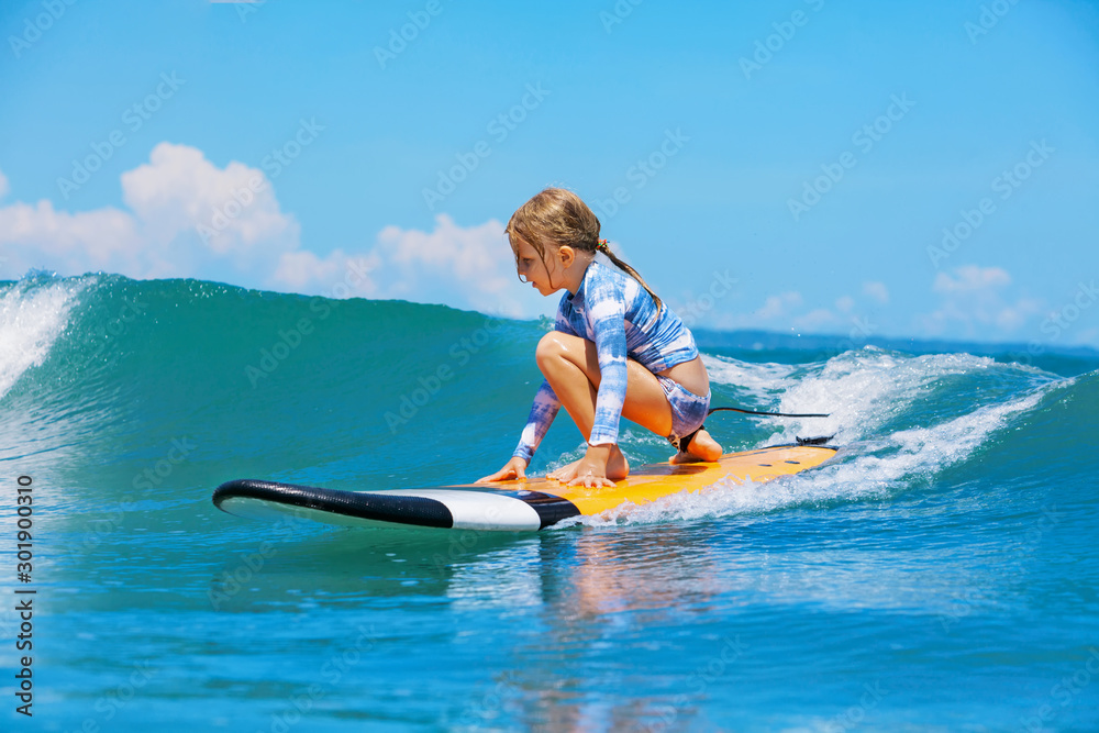 Happy baby girl - young surfer ride on surfboard with fun on sea waves. Active family lifestyle, kids outdoor water sport lessons and swimming activity in surf camp. Beach summer vacation with child.