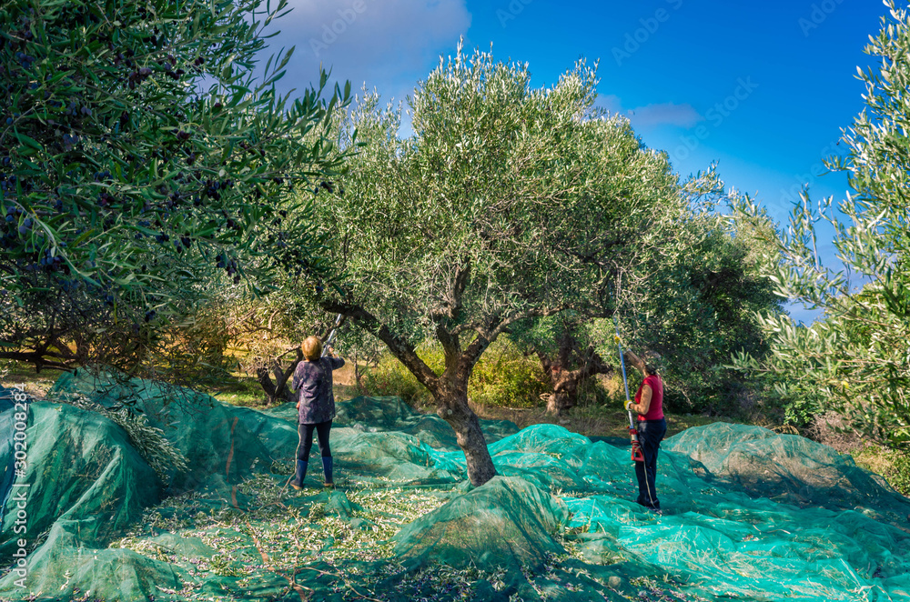 Fresh olives harvesting from women agriculturalists in an olive field in Crete, Greece