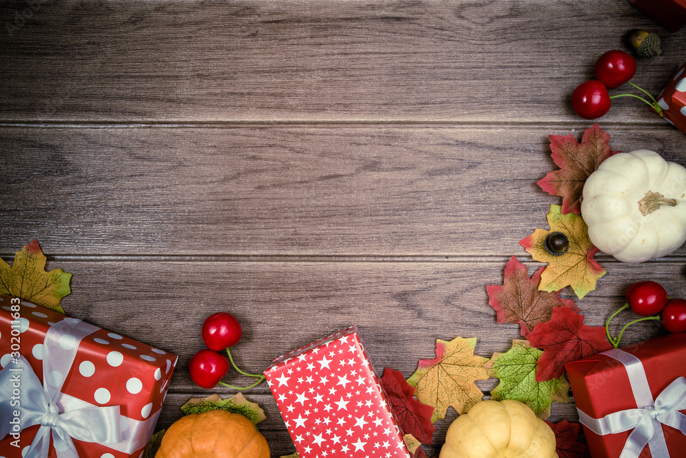 Gift box red and Accessories for Holiday Christmas background , thanksgiving Festival 2019, Copy space for text.