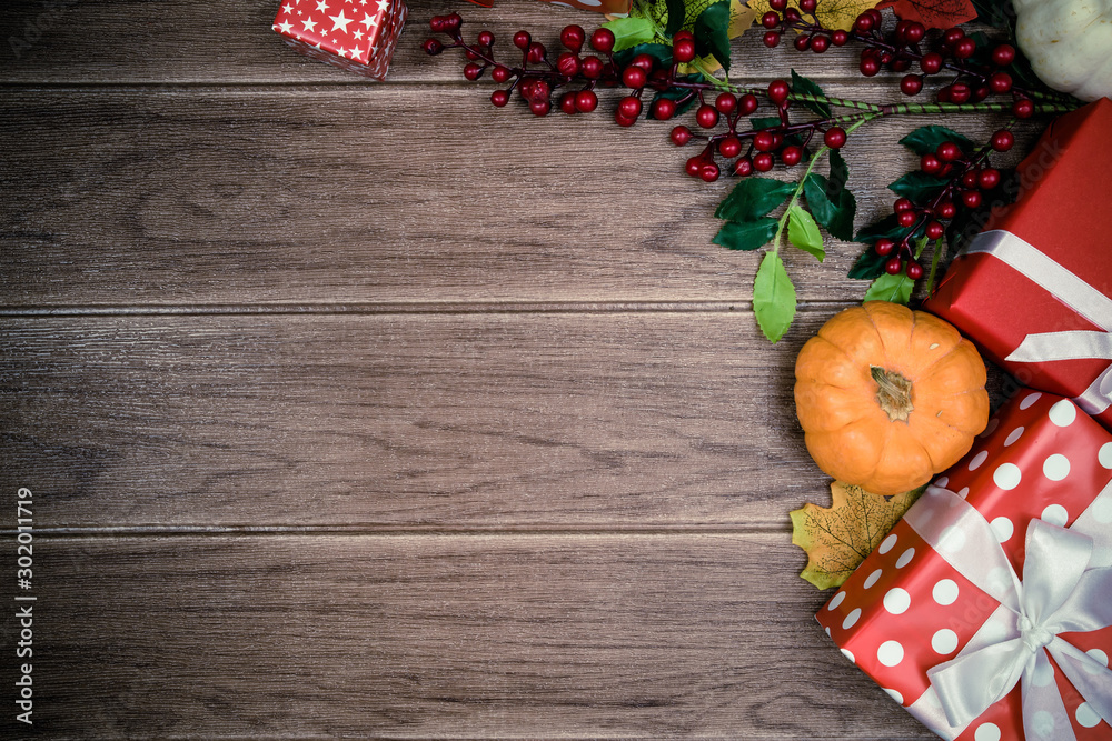 Gift box red and Accessories for Holiday Christmas background , thanksgiving Festival 2019, Copy space for text.