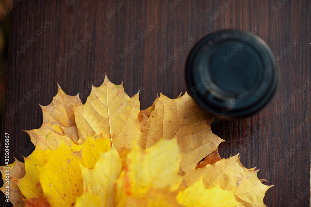 Closeup on yellow leaves and cup of coffee on bench