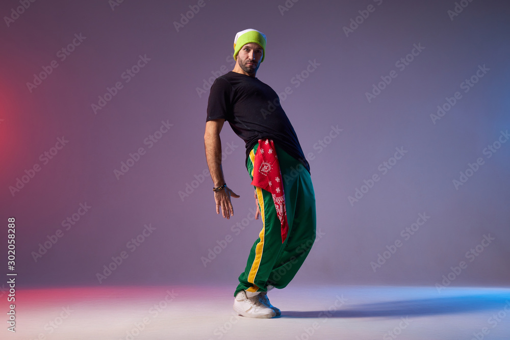 Young active man dressed in sportswear, performing hip hop style dance, training in dance studio, bending back, expressing emotions, looking at camera with brutal expression, street dance