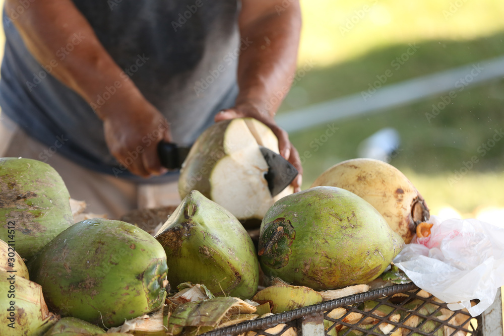 Man chopping green coconut with a machete