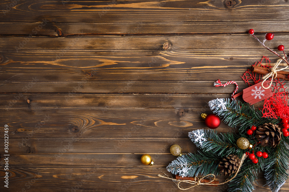 Fir branch with Christmas decorations on old wooden brown background with copy space for text