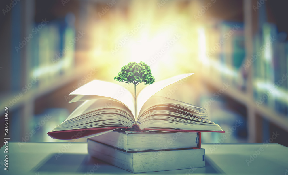 education concept with tree of knowledge planting on opening old big book in library with textbook, stack piles of text archive and aisle of bookshelves in school study class room