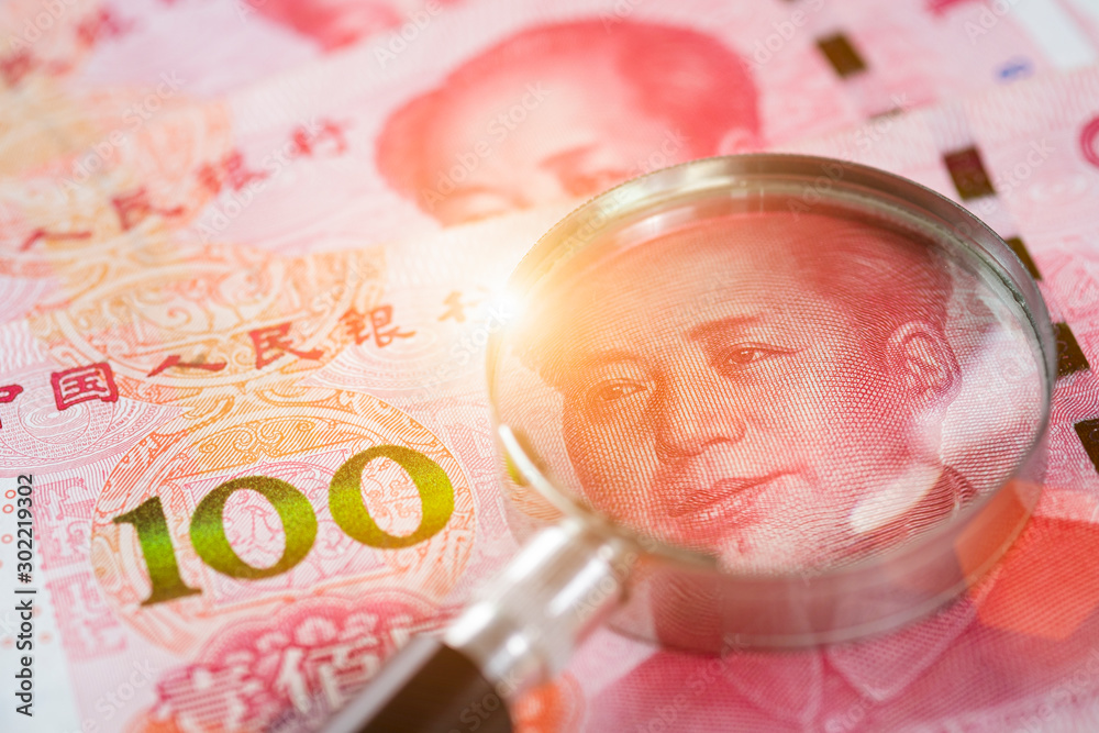 Hand holding magnifier glass for searching China Yuan sign and Yuan banknote.Value investor find suitable time for exchange rate.