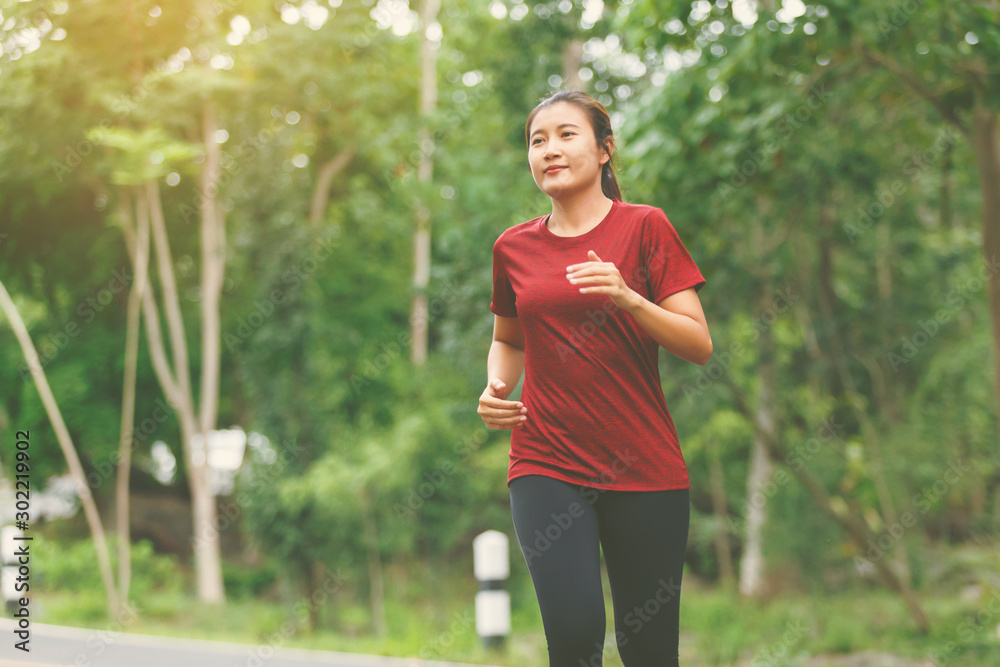 Front of woman runner and runing at the road surround with green forest.