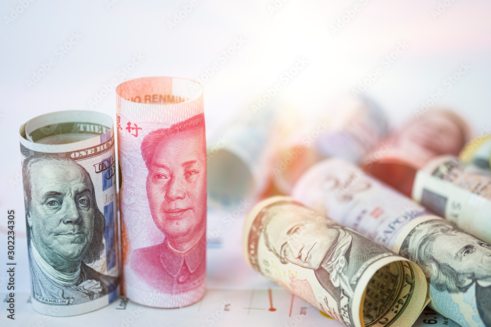 US dollar and Yuan banknote on financial report. Its is symbol for tariff trade war crisis between United States of America and China which the biggest economic country in the world.