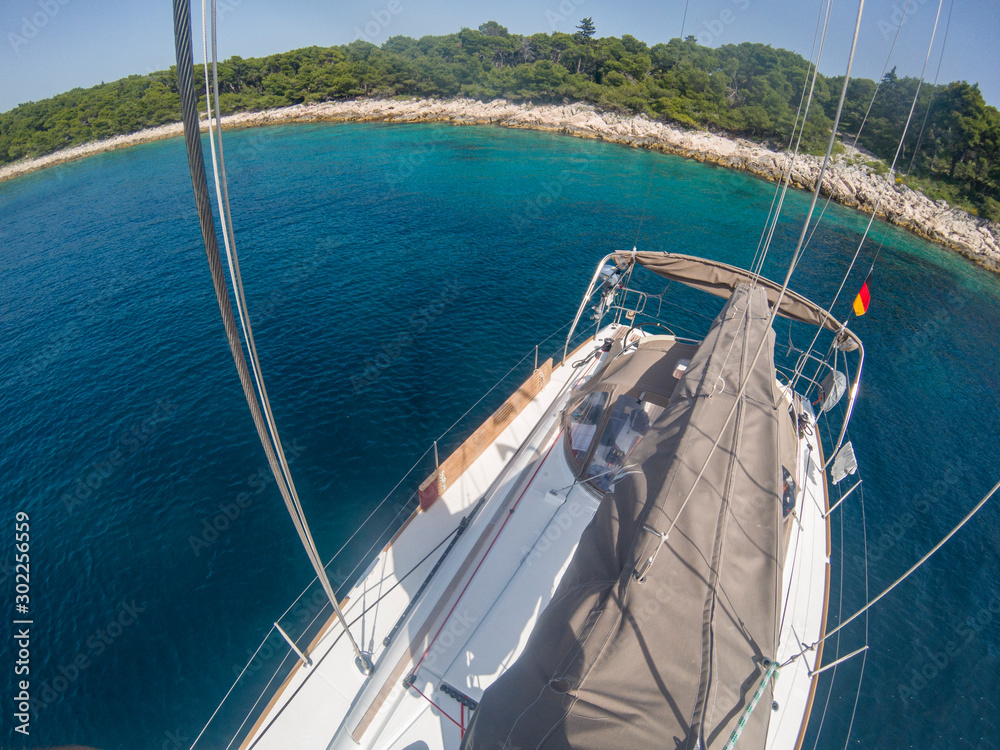 Segelyacht von oben im blauen Mittelmeer mit Weitwinkel