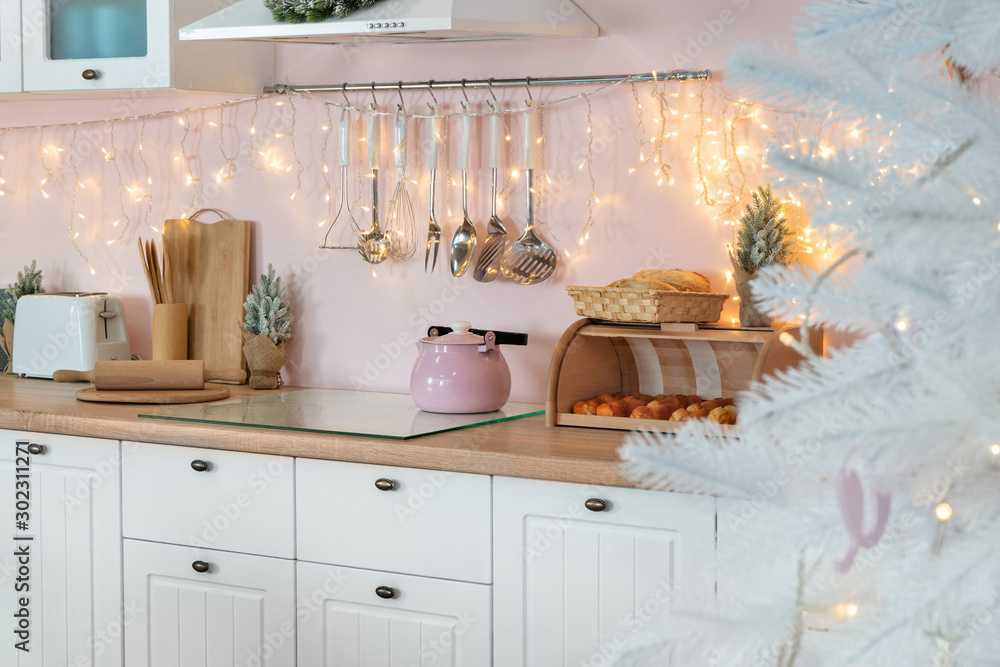 Closeup view on interior of modern white kitchen with pink walls and blue decor on a Christmas New year eve. Pine tree with lights