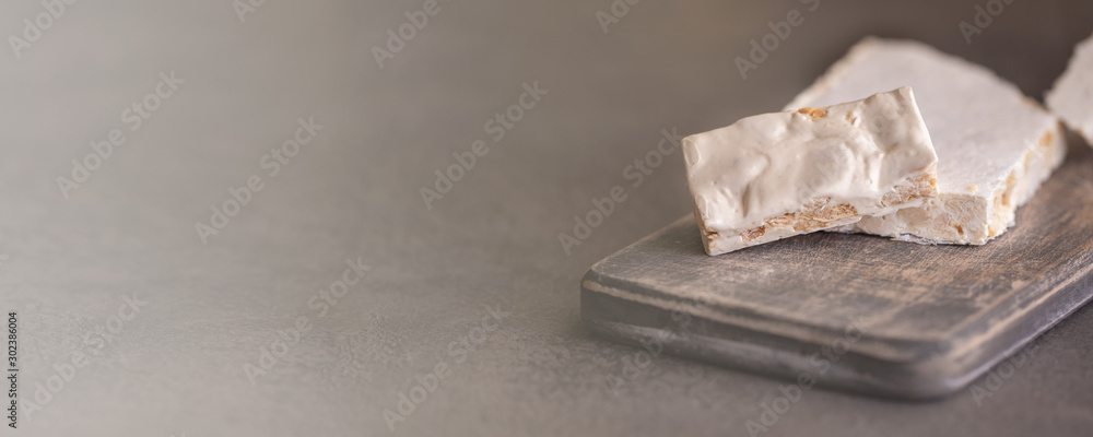 Turron duro or The nougat of Alicante, also called hard nougat. It traditional sweet consumed in Spain at Christmas time. Large image for banner with copy space