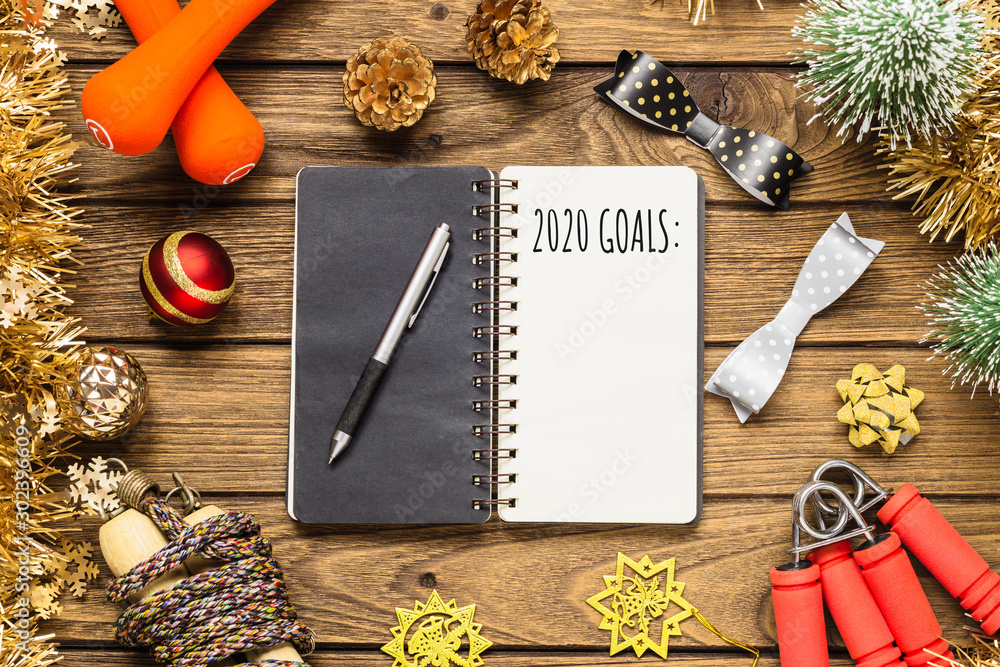 New year 2020 goals for healthy lifestyle, lose weight and join gym concept. 2020 Goals written in notebook with dumbbells, jump ropes and Christmas ornaments decorations.