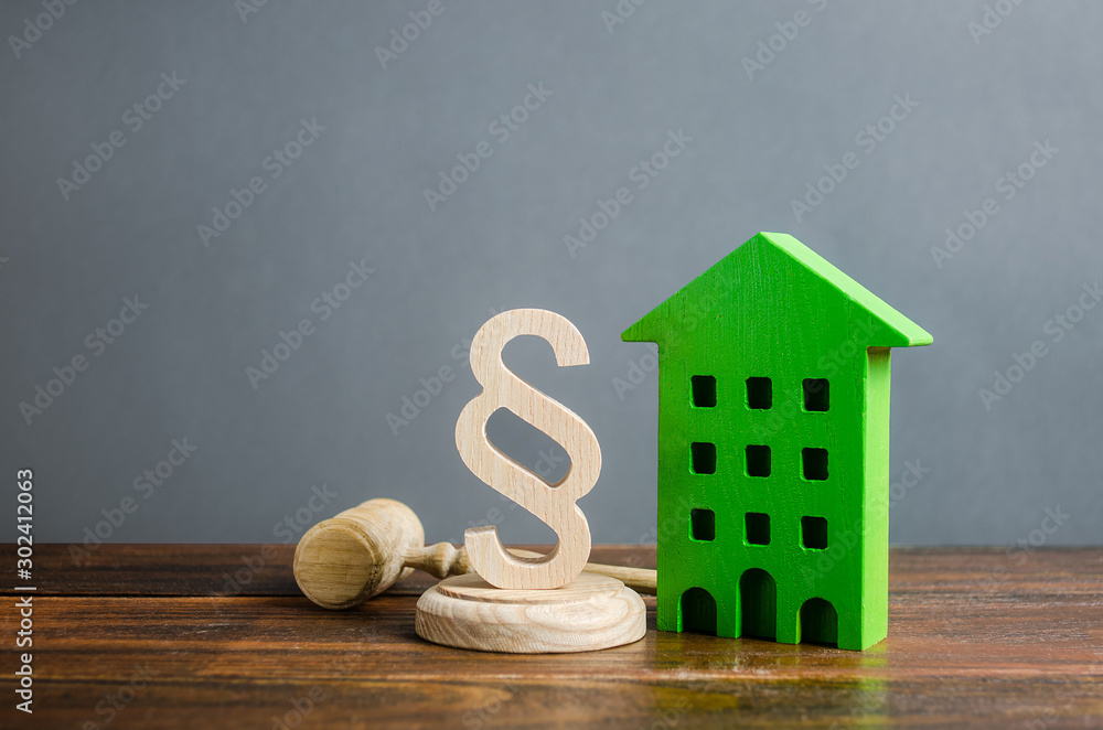 Green house and paragraph figurine with a judge gavel. Concept legislation on residential buildings and infrastructure. Standardization and construction of housing. Real estate legal services.