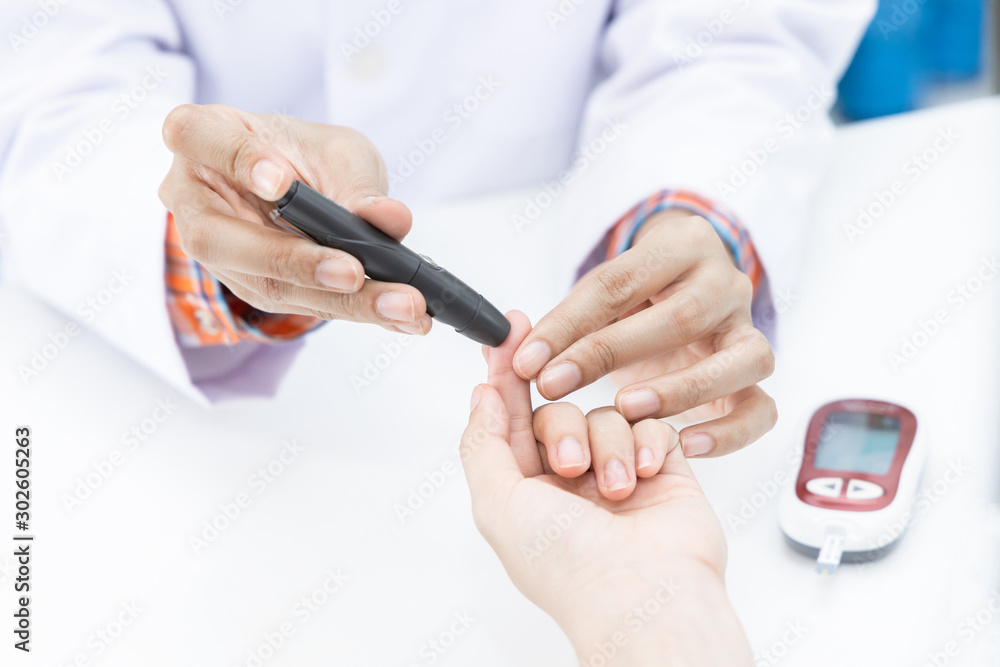 Pharmacist in pharmacy determines blood glucose level for insulin determination in patient, Sample blood analysis to determine blood group.