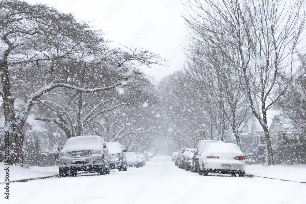 VANCOUVER CANADA - February 10 2019 : Snowing on the street in the residential area with car parks along the road. Blurry picture style.