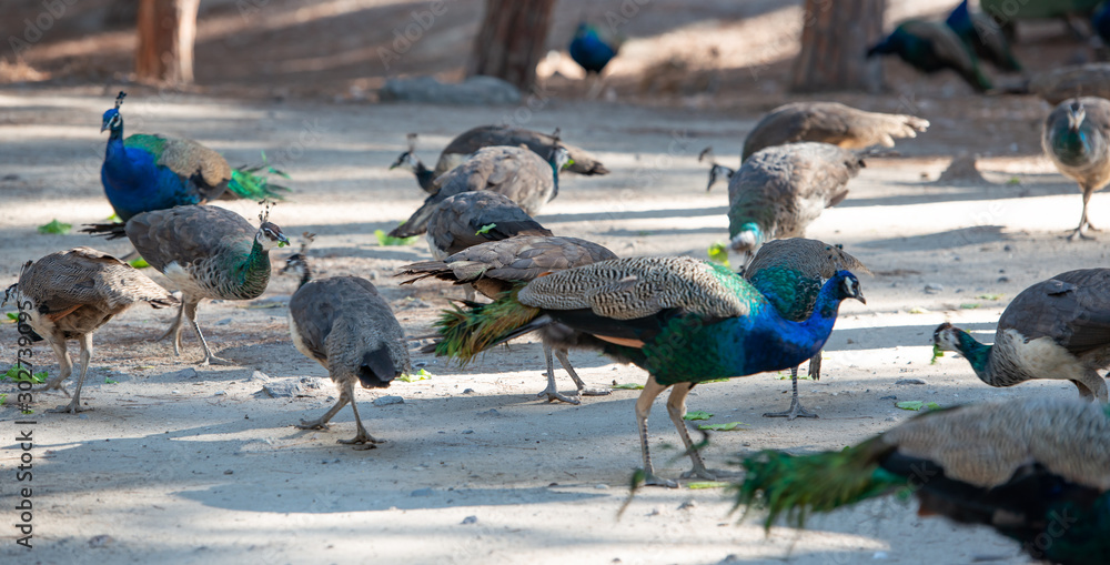 Wildlebende Bunte Pfauen, im Pfauenwald Plaka auf Kos Griechenland