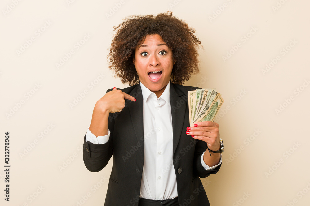 Young african american woman holding dollars surprised pointing at himself, smiling broadly.