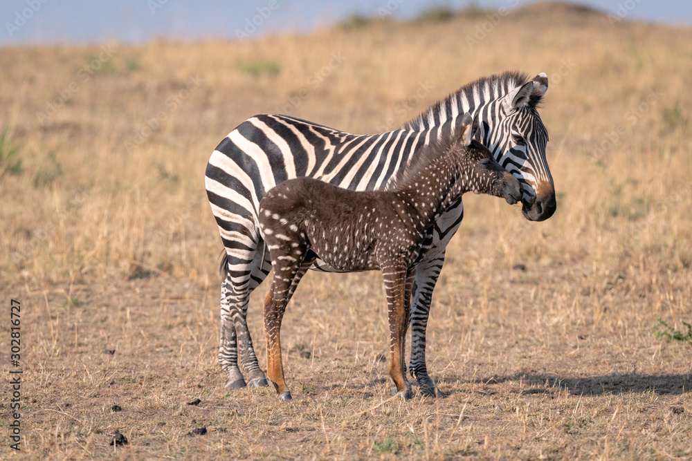 Rare zebra foal with polka dots (spots) instead of stripes, named Tira after the guide who first saw her, with its mother. Image taken in the Masai Mara National Park in Kenya.