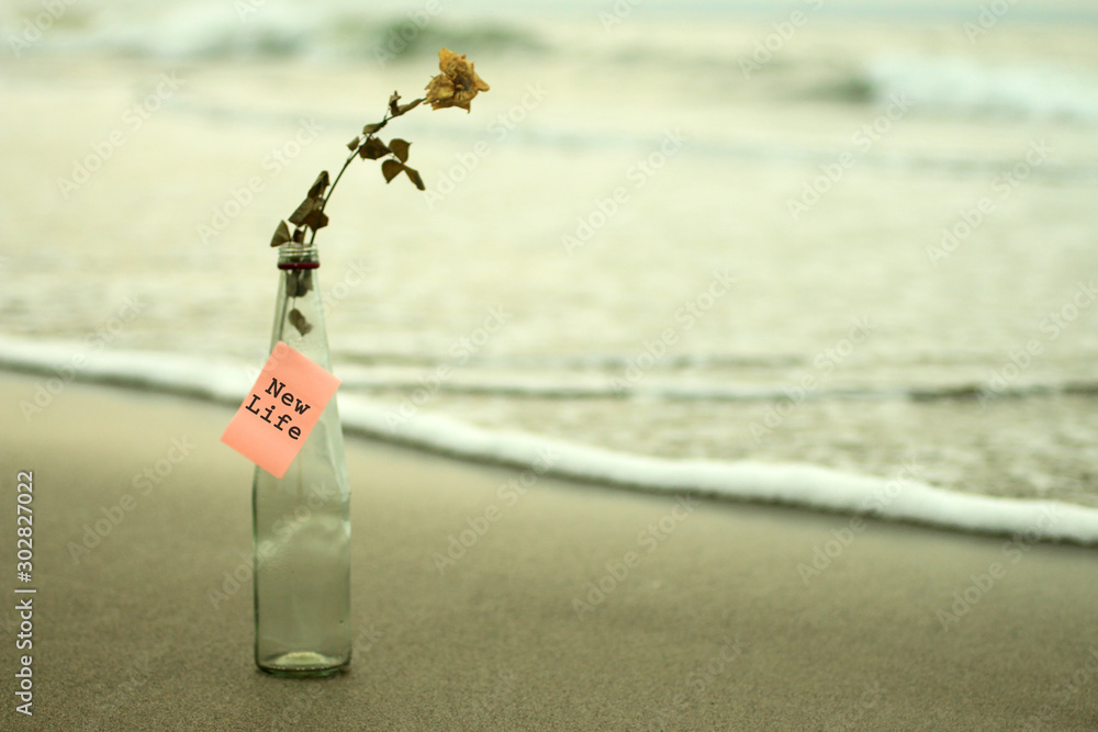 Paper message on the bottle - New Life. With dried white rose in a vase glass on sands , white light background of the beach & waves motion. New day, New Year, New life & still life concept with text.