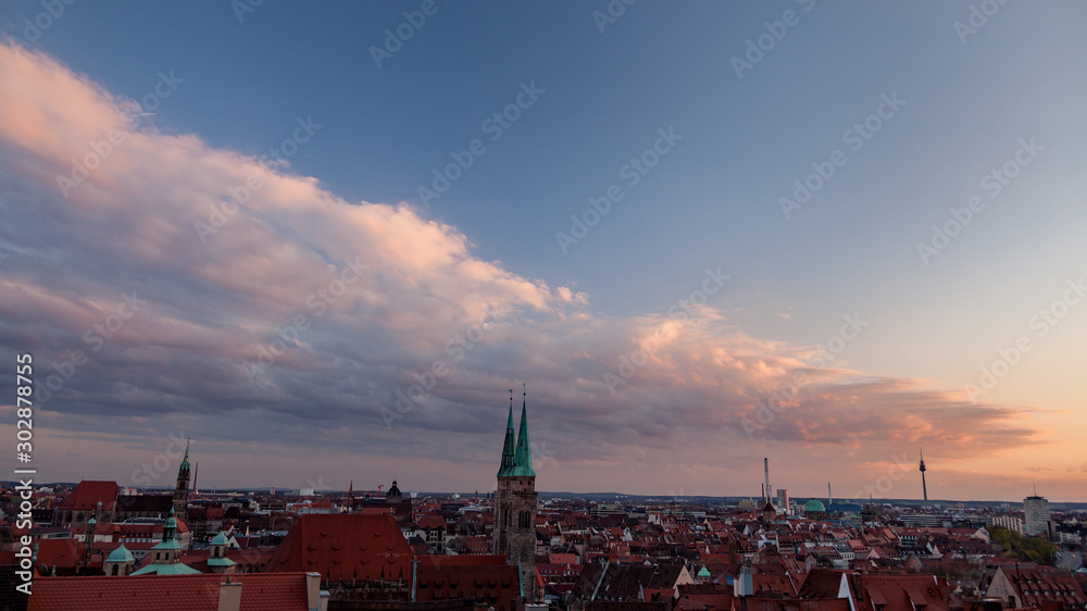 Panoramic view of the historic city of Nuremberg illuminated in beautiful golden evening light with dramatic clouds at sunset in summer Bavaria
