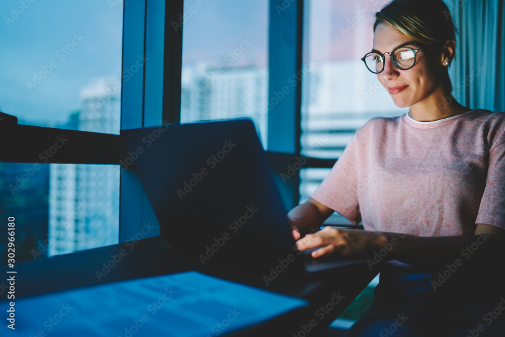 Light on the face from the laptop computer of concentrated student publishing own article on popular website while messaging in online chat via high speed internet sitting at netbook in evening time