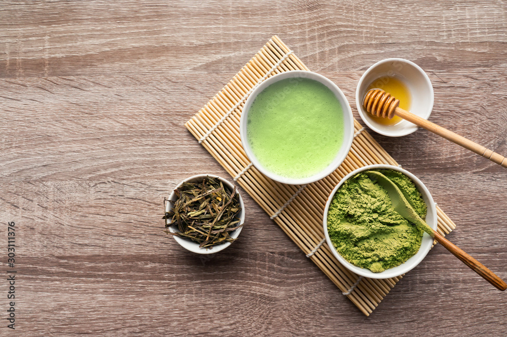 Matcha powder, green latte tea with foam on wooden table. Top view.