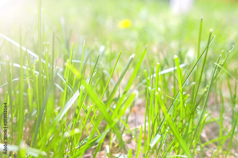 Background with green grass and flowers on the meadow swaying on the wind in wild nature. Glade with green plants in forest in spring summer time.
