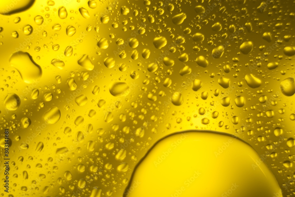 Yellow cooking Oil bubble and drops on water for background.