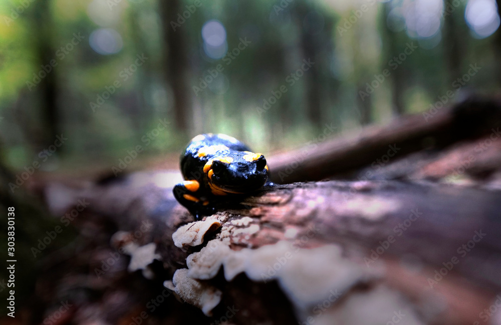 Salamandra plamista (Salamandra salamandra) w jesiennym mglistym lesie