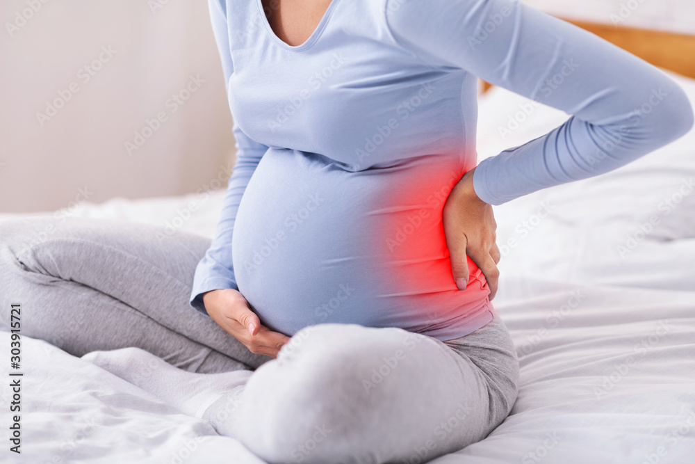 Unrecognizable Pregnant Lady Touching Back Sitting On Bed