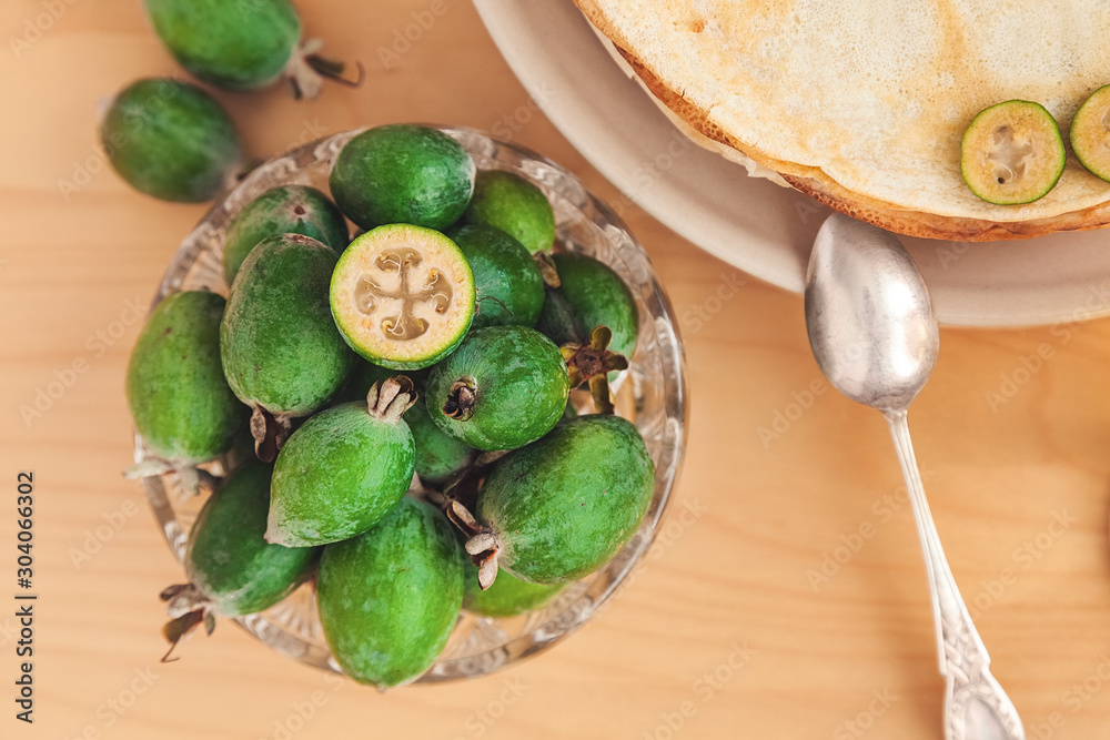 crystal plate with feijoa close-up, vintage silver spoon and thin pancakes