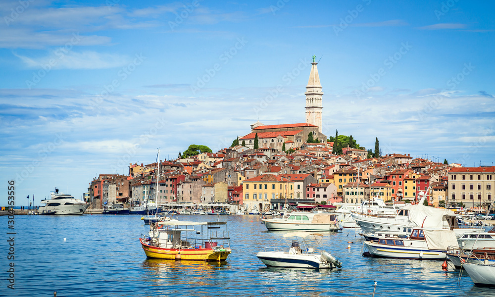 Scenic panoramic view of famous old town of Rovinj, a historic Mediterranean city in the north Adriatic sea, seen from busy tourist harbour area on a beautiful sunny day with blue sky, Istria, Croatia