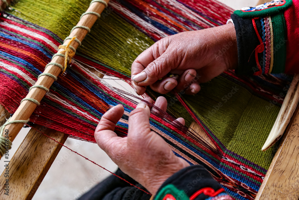 Weaving woman, hand-made colorful materials. Chinchero, Peru.