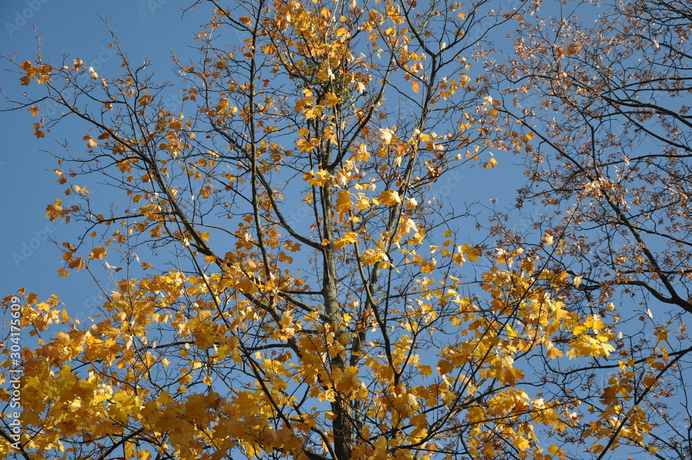 Autumn tree tops on sky background. Autumn trees sky view. Autumn tree tops in autumn forest scene