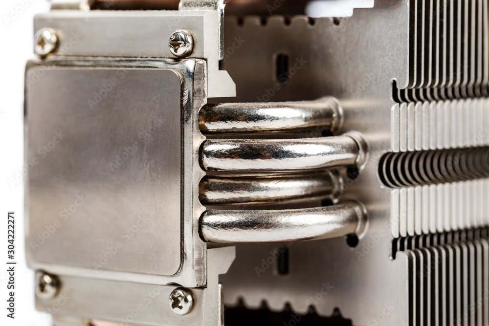 Modern tower heat radiator with four heatpipes closeup. Processor platform