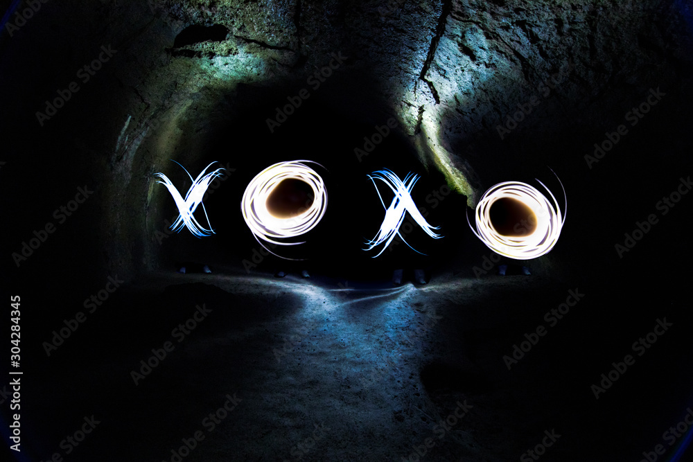 X O - Hugs and kisses X's and O's written with light in a dark cave