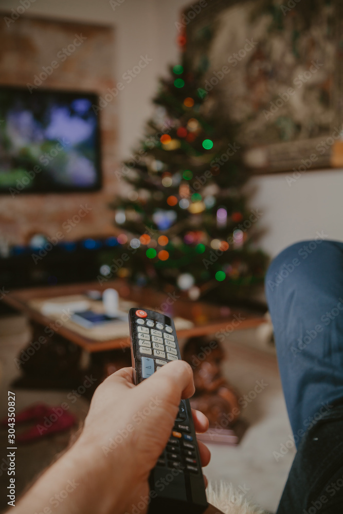 Close-up of man hand holding TV remote control
