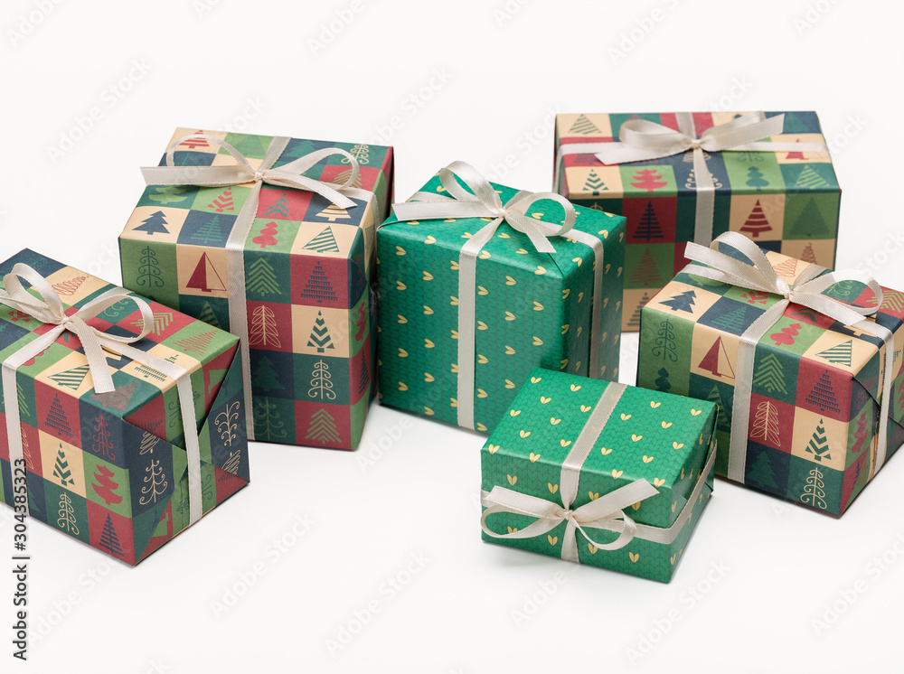 Gifts for Christmas and New Year in a beautifully packed box. Winter holiday, studio shot.