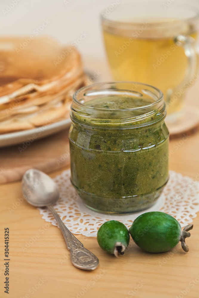 Jar of feijoa jam, two fruits, a cup of green tea, pancakes on a plate, vintage silver teaspoon